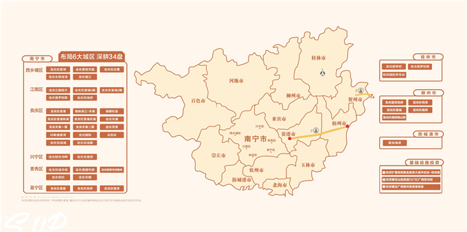 龙光2006年入邕耕桂,凭借着前瞻性眼光,以南宁为核心,将区域竞争优势不断外延。目前在整个广西区域市场亦处于领先地位,已成为广西经济社会发展和城市升级的重要参与者。