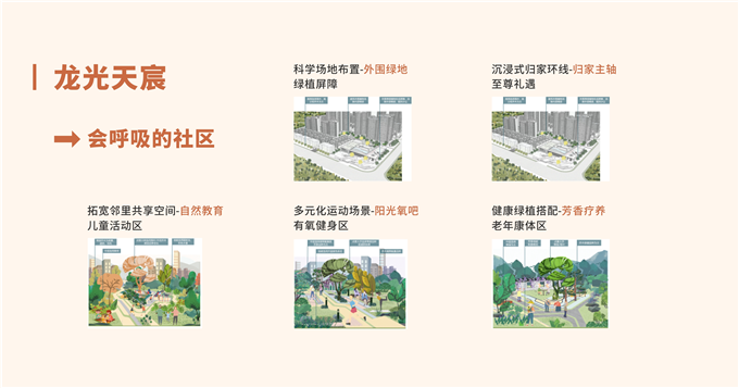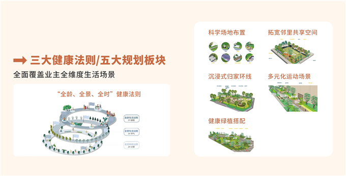 龙光从科学场地布置、归家环线、运动生活、邻里互动、健康植物五个角度提出了对健康社区的思考,探索出“全龄、全景、全时”健康生活法则。通过泛社区健康生态系统的打造,倡导更健康的社区生活场景,从室内到社区,打破空间限制,将健康生活延伸展开。