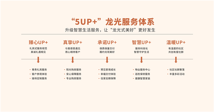品质缔造口碑,服务传递温度。龙光广西区域秉承一切以“客户至上,服务为先”的经营理念,以客户自身期待为中心,构架高品质的全方位服务生态。升级 “5UP+”龙光服务体系,从“臻心UP+”、“真挚UP+”、“承诺UP+”、“智慧UP+”、“温暖UP+”五大板块构建智慧服务,从案场体验、交付再到入住,让产品服务更丰满,让生活更丰盈、美好。