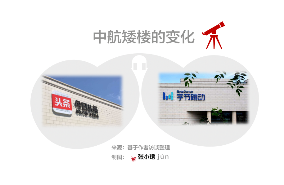张一鸣领军走向全球的启航地,是坐落于北京海淀知春路甲48号的中航矮楼。2016年伊始,员工随高层乔迁至这栋矮胖,只有两层高的方形、米白色建筑内。这里原是航空博物馆所在地,直升机能起降于屋顶。
