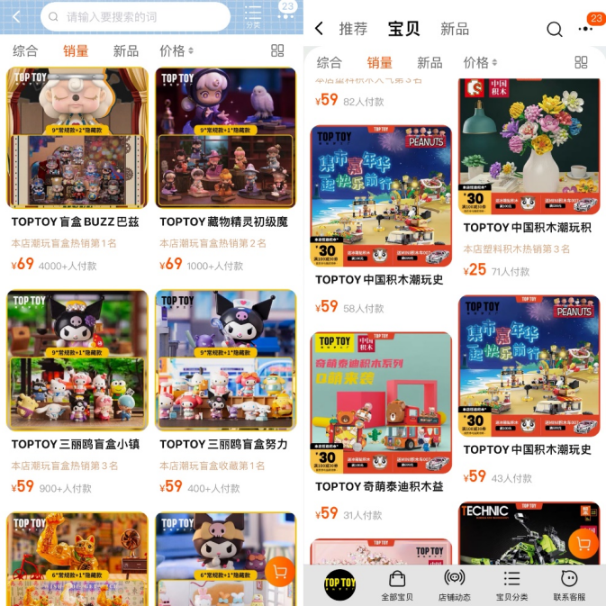 而进入TOPTOY的官方旗舰店,仅有两款独家盲盒产品销量过千,积木产品则很多带有乐高的影子。