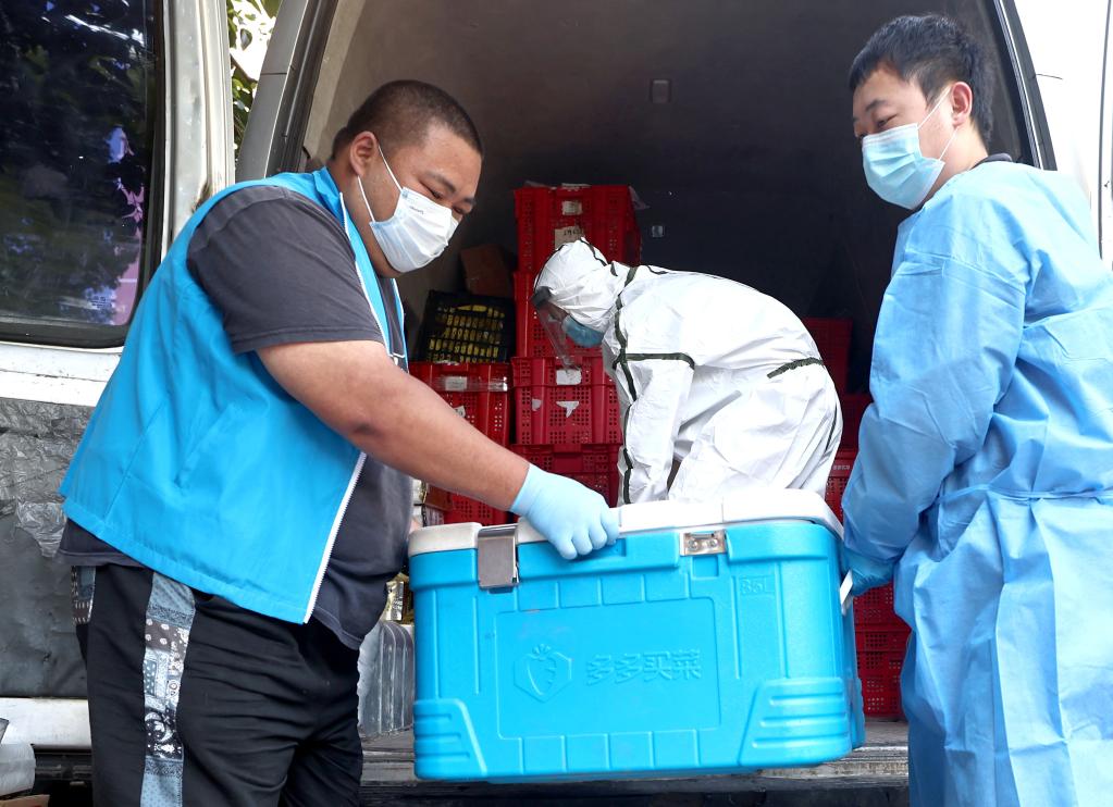 2022年4月17日,李晓俊在闵行区虹梅景苑二街坊从货车上卸货。(新华社记者 陈建力 摄)