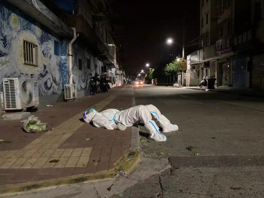 在上海市宝山区高境镇共和十村一位志愿者在送物资的路上,实在太累直接在路边躺下休息。(受访者供图)