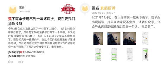 有消费者表示:“2月在京东直营店买了一个蕉下太阳伞,11月的时候伞帽自己掉了,随后花了10元运费补寄了一个伞帽,12月撑伞骨架又自己坏了,人工说满270天不能售后,要加80元寄一把新的伞,买的时候不标注维修时间,明显是质量问题,花了180买的伞,一年不到就坏了两次;雨伞使用五个月伞头出现断裂,售后无门。”