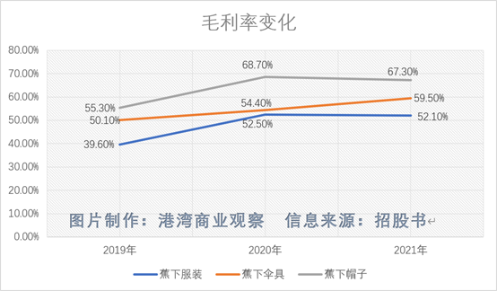如果了解了蕉下的毛利率,那价格的差距可以说确实合理。业务毛利来看,蕉下的服装、伞具及帽子近年的毛利率都在不断上升,2021年更是达到了52.1%、59.5%及67.3%。
