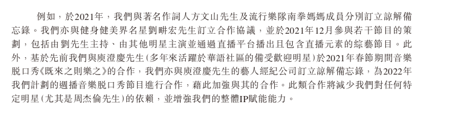 在招股书中,巨星传奇表示,任何IP赋能无疑都能促进产品销售,此乃本集团的销售及营销策略之一。沿袭着这个思路,巨星传奇将触角伸向了周杰伦周边的明星们,例如他的“御用词人”方文山、好朋友庾澄庆、刘畊宏以及组合南拳妈妈等,探索第二个“IP”,以减少对于周杰伦的过度依赖。