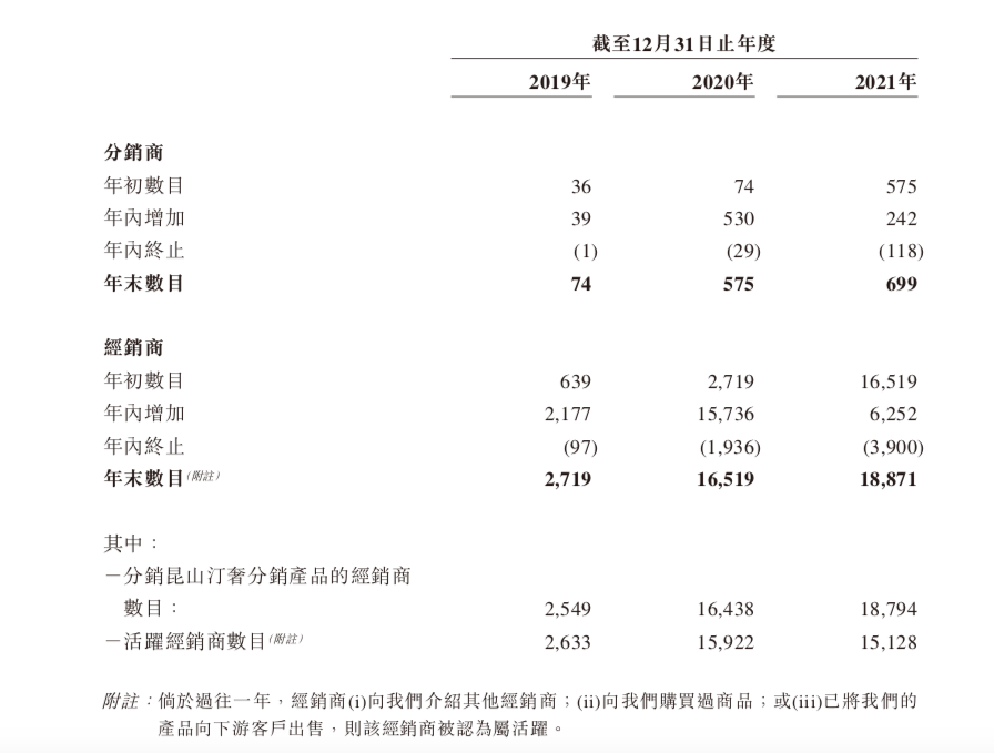 分销商从昆山汀奢拿货,一般不直接卖货给消费者,而是销售给下游的经销商,赚取差价。几万名经销商,才是直接面向消费者的“蚂蚁大军”。
