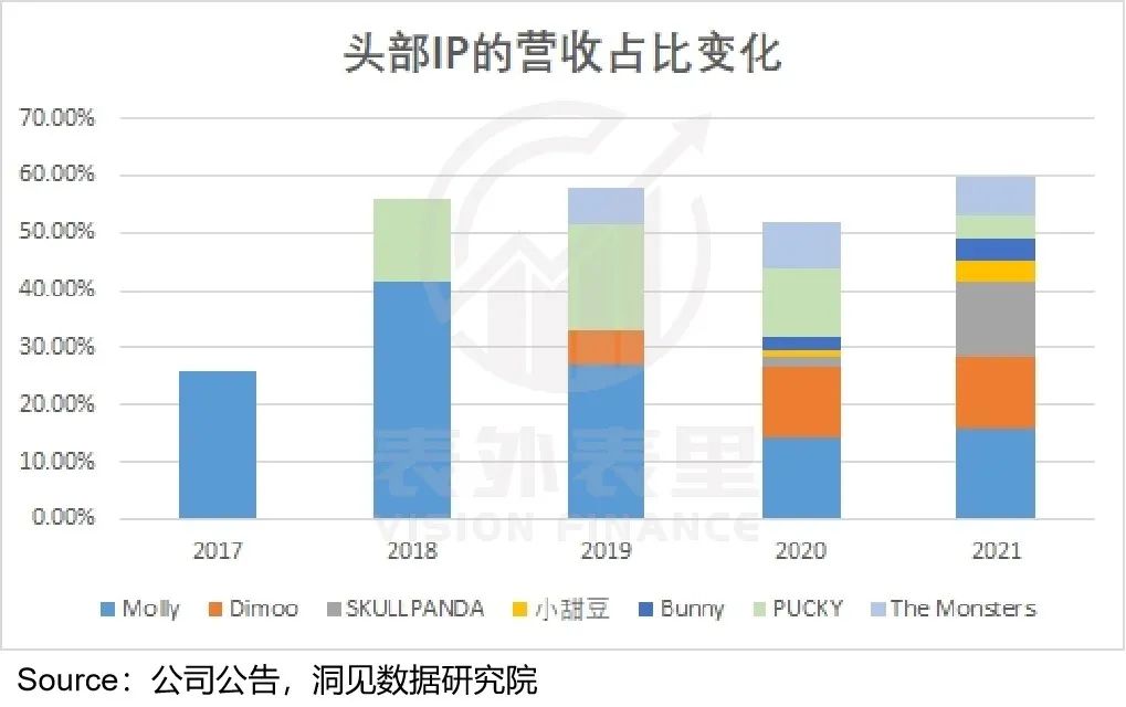 然而企业的市场、渠道资源是有限的,厚此就难免薄彼——前期泡泡玛特只有Molly和Pucky,自然集中。但新IP不断推出,资源侧重变了。
