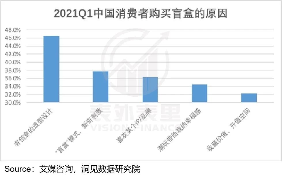 比如,据艾媒咨询2021Q1数据显示,中国有46.46%消费者,基于造型设计有创意,而购买盲盒。相比之下,仅有36.32%的消费者,因喜欢某个IP/品牌而购买。