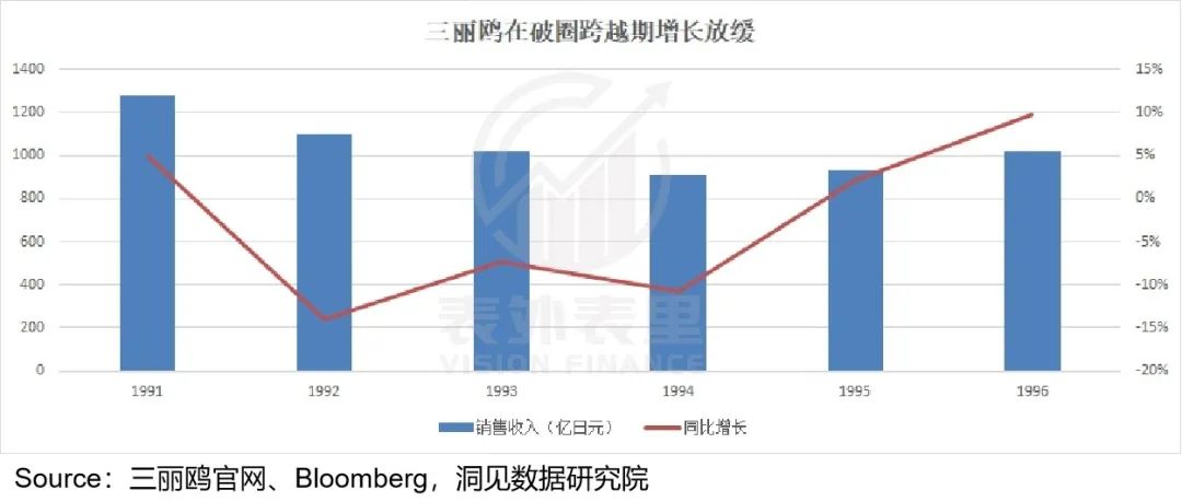 如下图,1991-1995年三丽鸥的业绩增速持续下滑,甚至连续三年负增长。