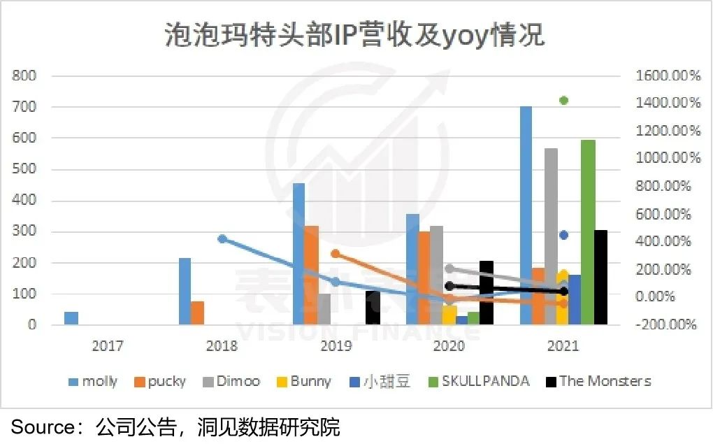 然而从单品类看,和Bunny、SKULLPANDA等新IP的营收快速增长相比, Molly的营收增速出现下滑波动,Pucky营收2021年出现负增长。