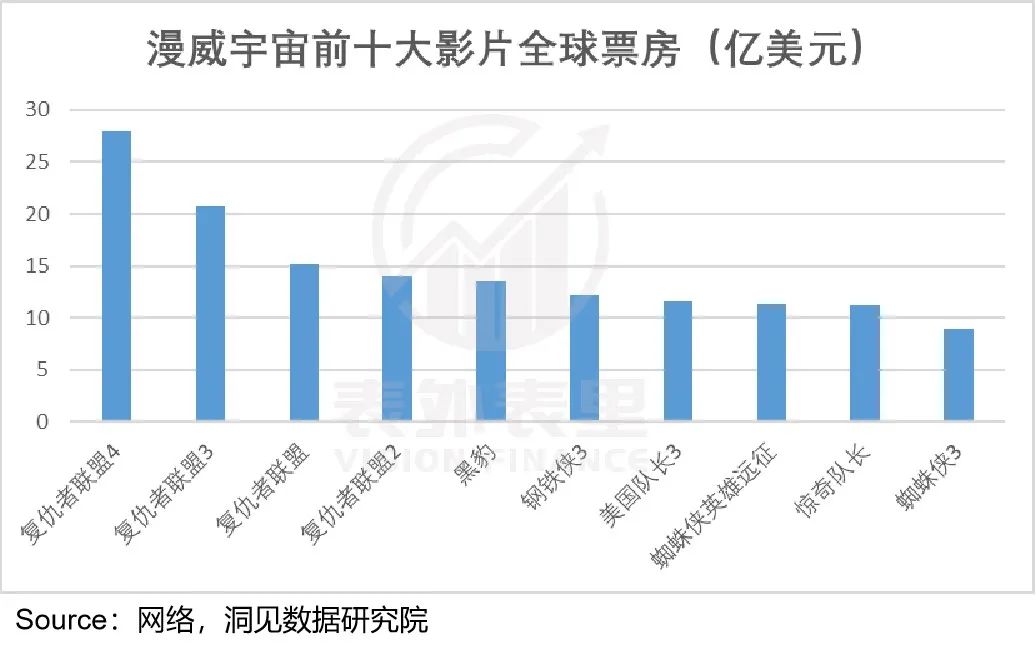 可以看到,最能彰显各英雄协同效应的《复仇者联盟》系列电影,是最卖座的。