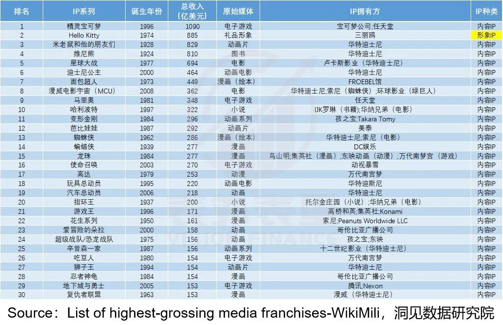 而今年维基百科最新的“媒体特许经营产品畅销榜”显示,全球最有价值的IP top30中,形象IP只有 Hello Kitty一个,其他都为内容IP。