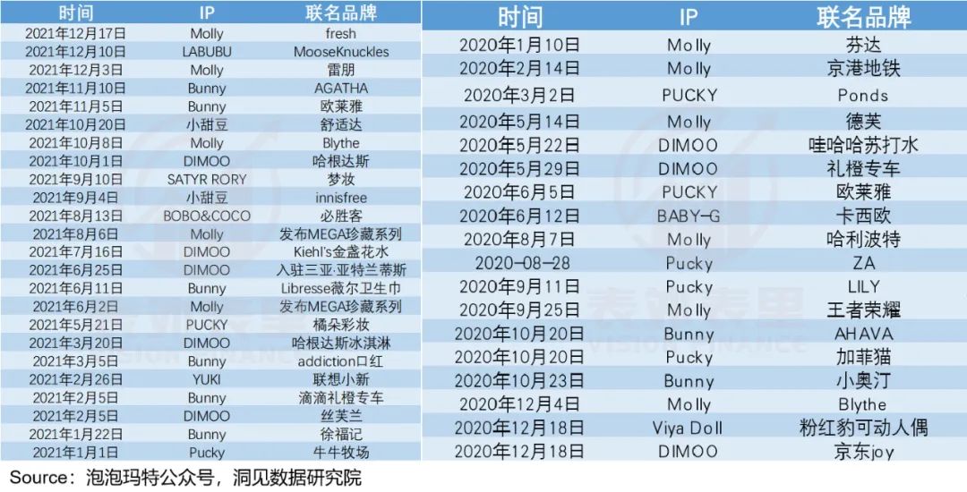 相同区间里,Molly的联名次数,则从6次降到了5次;Pucky更惨烈,从5次下滑到2次。而曝光度下跌,也就有了上述的收入波动影响。