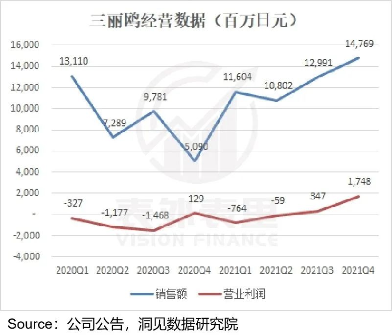 新增长曲线释放下,2020Q4开始三丽鸥的销售额反转,同时利润也在2021Q3扭亏为盈。