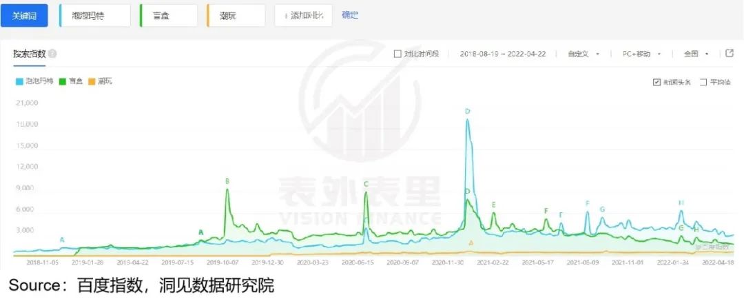 然而潮玩群并不认同,认为泡泡玛特还是个盲盒公司。而从百度热度上看,比起潮玩,其趋势确实和盲盒更一致。