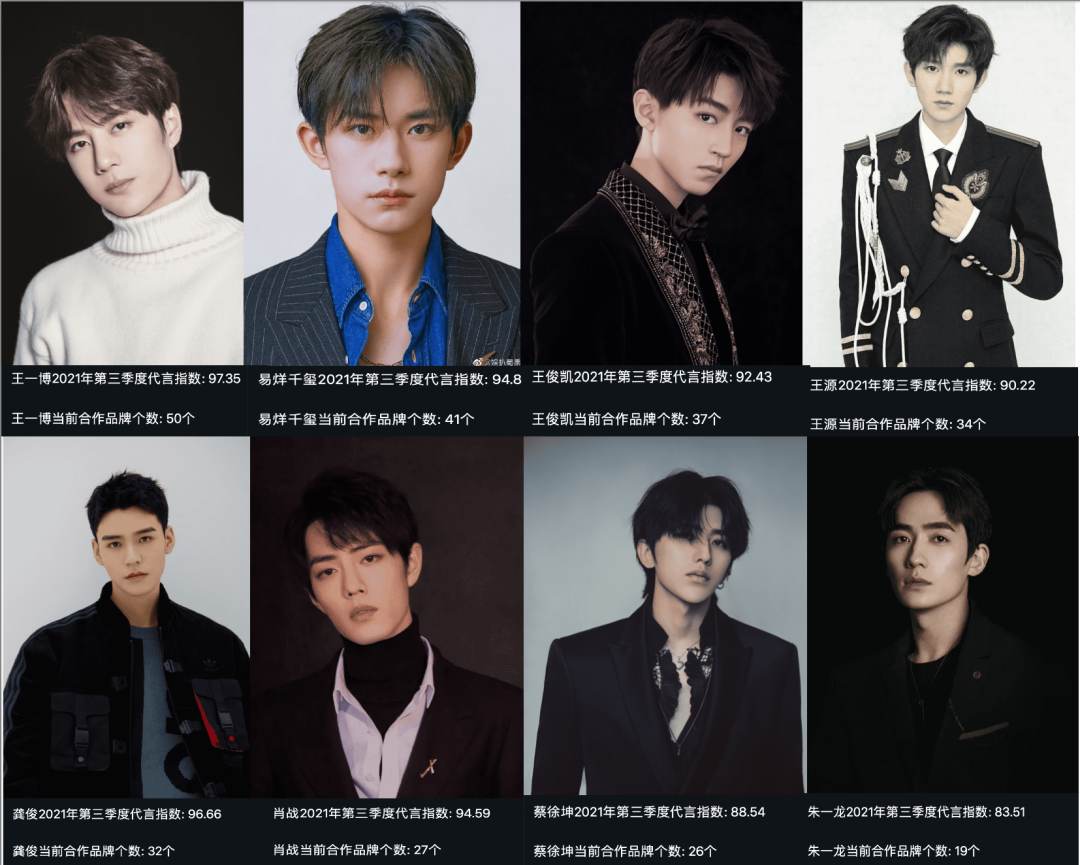 2021年,王一博、易烊千玺、王俊凯、王源、龚俊、肖战、蔡徐坤、朱一龙(按代言数量排名)等顶流男星,代言数量最多的王一博跟50个品牌合作,最少的朱一龙也有19个合作品牌,平均下来,每人合作品牌数超30个。