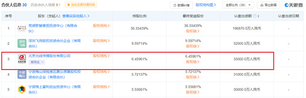 华晟领飞目前有30位合伙人,光线传媒以6.46%的持股比例位居第三,认缴出资额为3.50亿元。