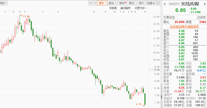 当天上午,光线传媒股价触及近年新低6.78元/股;收盘价为6.85元/股,大跌11.15%;和2022年年初股价13.08元/股相比,目前市值已跌去近一半。