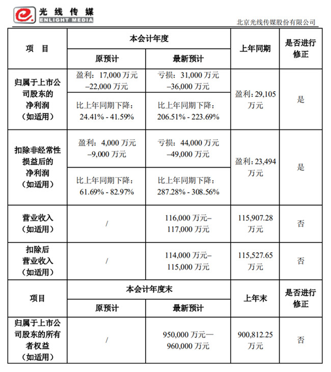 4月22日,光线传媒(300251.SZ)披露《2021年度业绩预告修正公告》,将2021年度业绩预告向下修正,归属于上市公司股东的净利润由原预计盈利1.70亿元至2.20亿元修正为亏损3.10亿元至3.6亿元,与上年同期相比,最新预计将下降206.51%至223.69%。