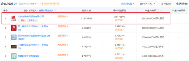 天眼查显示,在华晟领势的25名合伙人当中,光线传媒认缴出资占比为最大(持股31.98%),认缴出资额为3.39亿元。