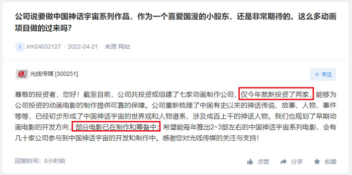 4月24日,光线传媒在投资者互动平台表示,截至目前,公司共投资或组建了七家动画制作公司,仅今年就新投资了两家。