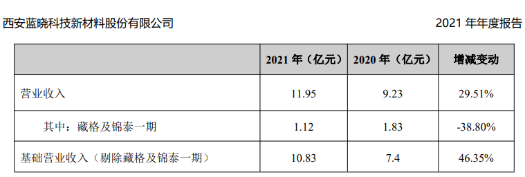 蓝晓科技的应收账款一直存在问题。在2021年年报中,公司特别标明了在藏格及锦泰一期项目实现营收1.12亿元,同比减少38.80%;剔除该项目的基础营收为10.83亿元,同比增长46.35%。