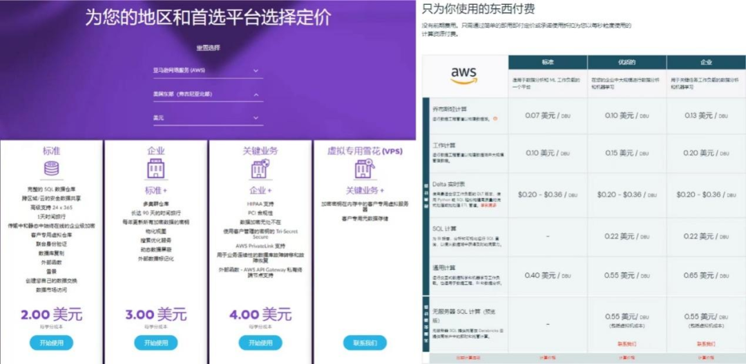 另一方面,通过对比官网收费方式发现,虽然是平台租出服务器的计算资源,但这些服务器整个系统都建立在主要的云厂商的基础服务上。以Snowflake(左)为例,同样是以每秒粒度使用的计算资源付费,Snowflake是平台和云厂商打包收费方式,客户对底层服务界面(如EC2)和上游的Snowflake的成本花费要一次性付清,但比例是怎样无从得知,而打包之后Snowflake需要支付给云厂商另外成本,这在无形中增加了费用风险。