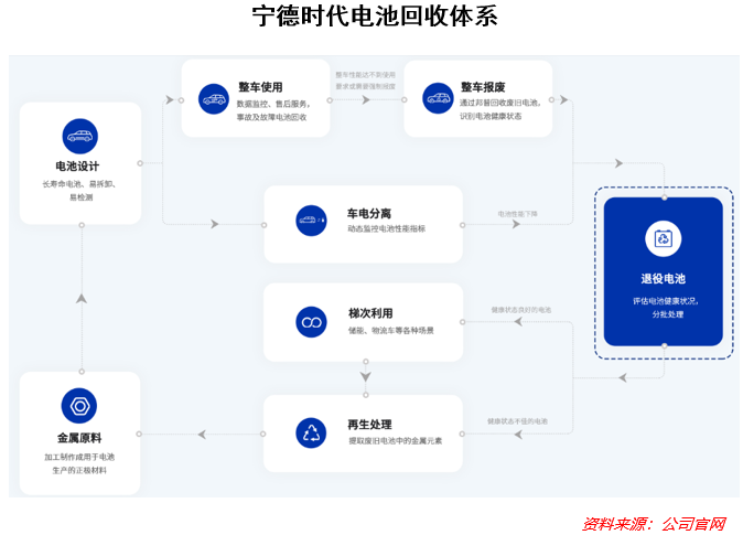 不仅如此,宁德时代还完成了布局电池回收的重要战略,依托子公司广东邦普,与产业链上下游客户携手打造了“电池生产→使用→梯次利用→回收与资源再生”的闭环。目前,公司已有12万吨废旧电池处理能力,可实现99.3%的镍钴锰金属回收率,废旧电池回收国内占比达51%,覆盖长三角、珠三角、中部地区等主要动力电池市场。