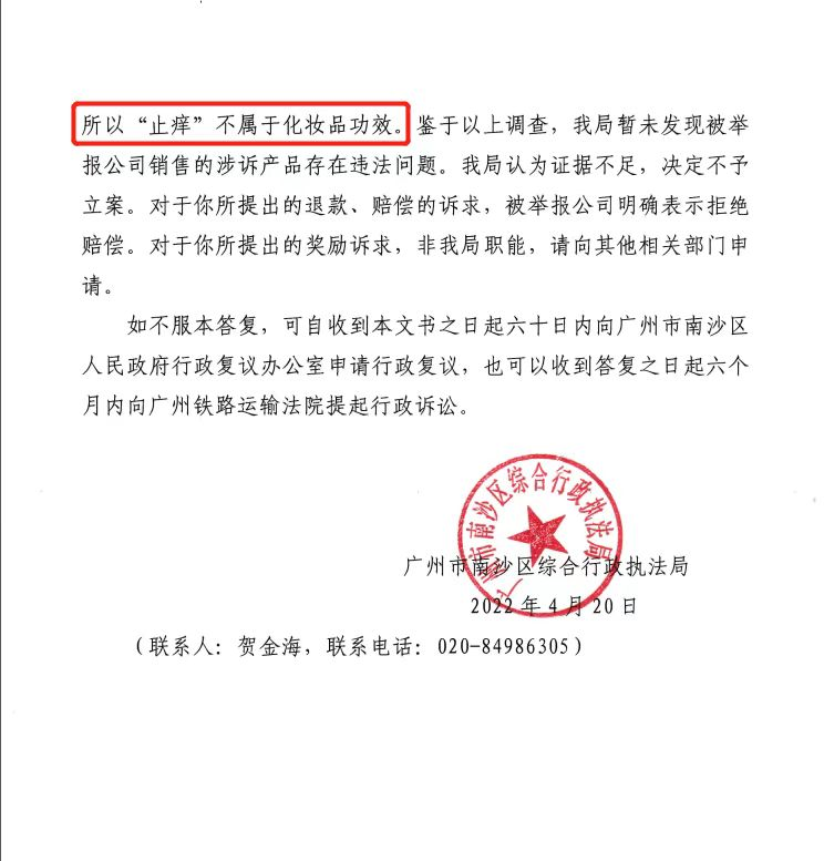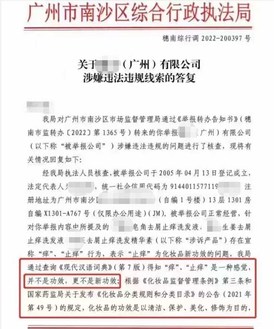 对此,广州市南沙区综合行政执法局(下称南沙执法局)对所举报的内容进行核查并称,“通过查询《现代汉语词典》(第7版)得知‘痒’‘止痒’是一种感觉,并不是功效,更不是新功效,另根据化妆品定义,认为‘止痒’不属于化妆品功效”。