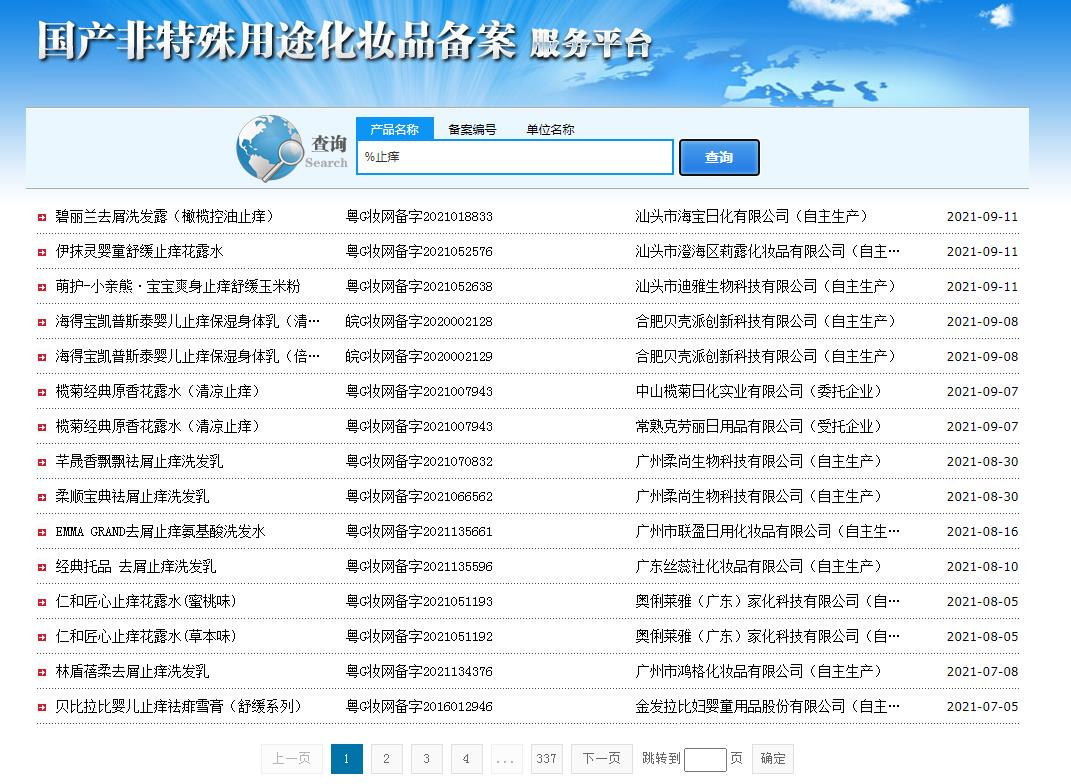 青眼在国产非特殊用途化妆品备案服务平台上以“止痒”为关键词进行搜索,共显示有近5000条备案(部分产品已注销),主要包含了洗发水/乳、花露水、儿童止痒膏、喷雾等品类。