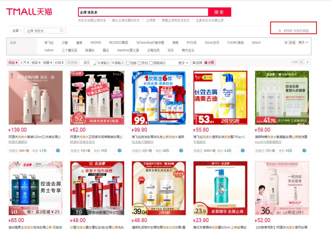 此外,青眼分别以“止痒洗发水”和“止痒花露水”为关键词在天猫平台上进行搜索,则显示各有21558件和2136件相关商品。其中,宣称“止痒”洗发水的品牌,包括了清扬、海飞丝、霸王、阿道夫、沙宣等众多知名品牌;宣称“止痒”的花露水品牌则涵盖了六神、隆力奇、青蛙王子、润本等。上述含“止痒”宣称的产品中,不少产品月销已超过1万件,部分产品甚至达到了月销10万+件。