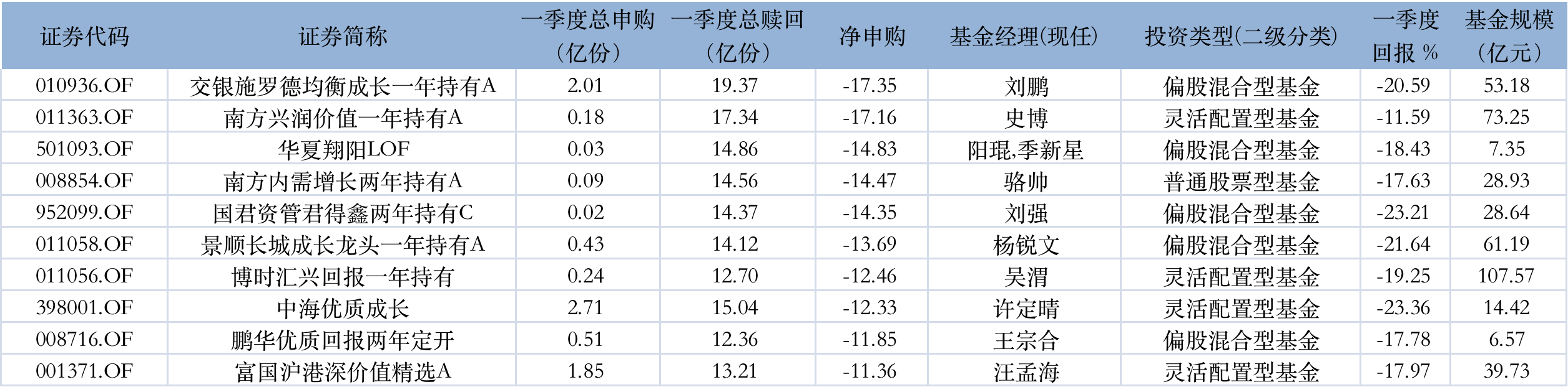 王宗合管理的鹏华优质回报两年定开今年一季度也迎来了成立以来的首个申赎日,据wind显示,该只基金今年一季度回报为-17.78%,净赎回份额为11.85亿份,基金最新规模为6.57亿元。同时,杨锐文管理的景顺长城成长龙头一年持有A、胡昕炜管理的汇添富价值创造、汇添富消费升级A、杨浩管理的交银内核驱动等多只基金一季度净赎回份额也均超过6亿份。