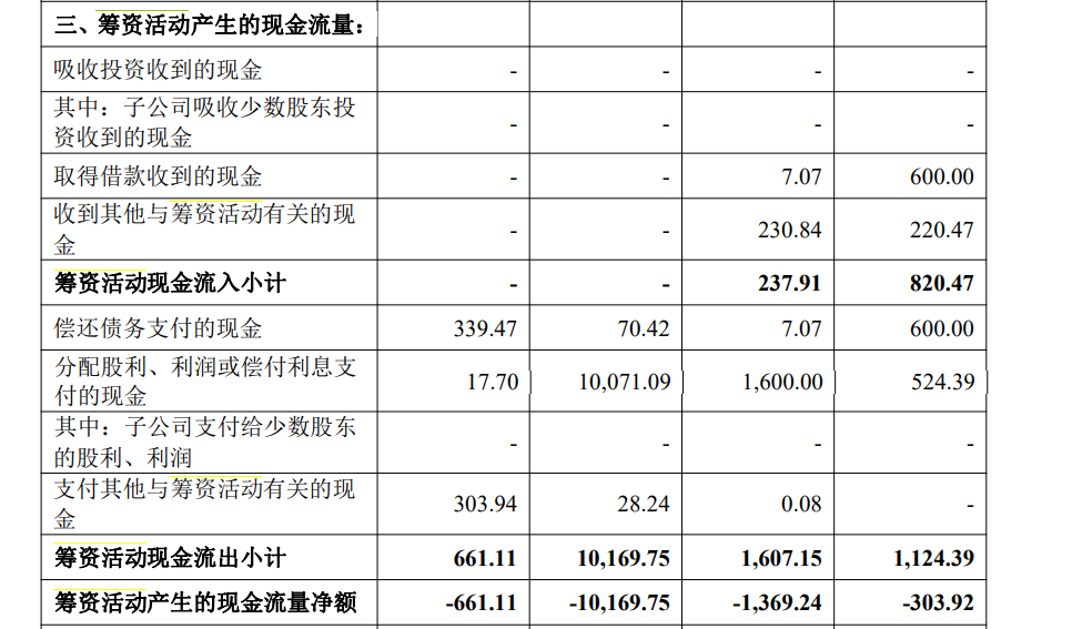 再看募集0.9亿元用于补充流动资金。界面新闻记者发现,金泉旅游筹资活动产生的现金流量净额常年为负,而大笔支出都用于分配股利、利润或偿还利息支付的现金。报告期内此项金额分别约为524万元、1600万元、1亿元及17.7万元,总计约达1.22亿元。