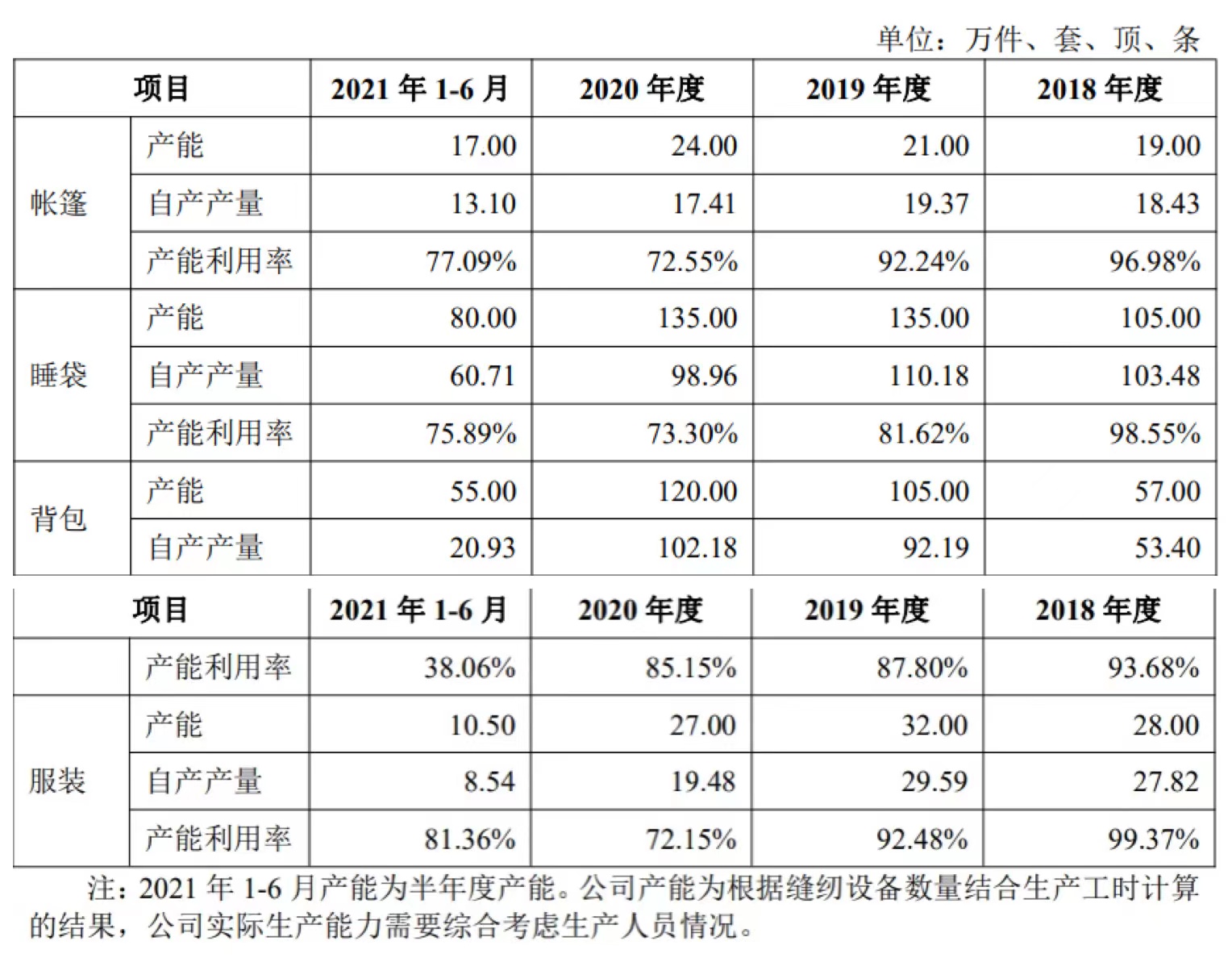 界面新闻记者发现,2018-2020年金泉旅游主营产品帐篷的产能在不断上升,但产能利用率却在不断下滑,由96.98%下滑到72.55%。同时睡袋的产能也有上升趋势,而产能利用率从98.55%下滑至73.3%。并且除了帐篷和睡袋外,背包和服装的产能利用率也在一路下滑。