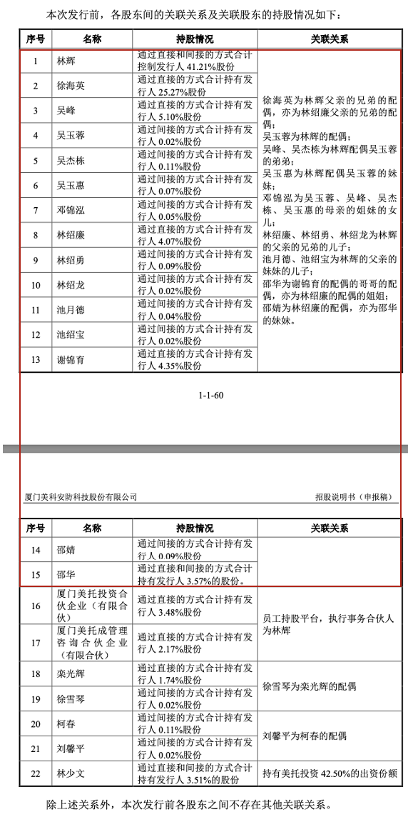 IPO前,美科科技的控股股东为林辉,直接持有35.56%的股份;实际控制人为林辉、吴玉蓉夫妇,二人直接持有35.56%的股份,通过美托投资间接控制3.48%的股份,通过美托成管理间接控制2.17%的股份,合计控制公司41.21%的股份。