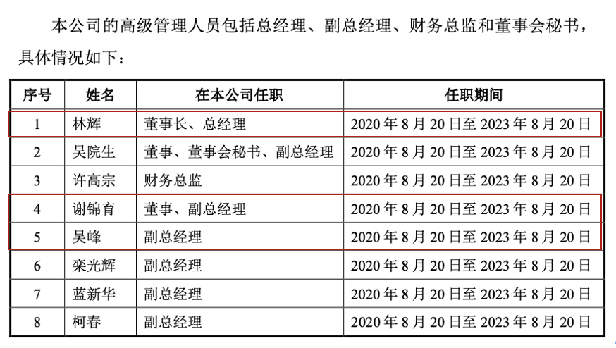 除了持股,多名亲属也身居要职。8名高管中,林家人3位,余下5位为外人。