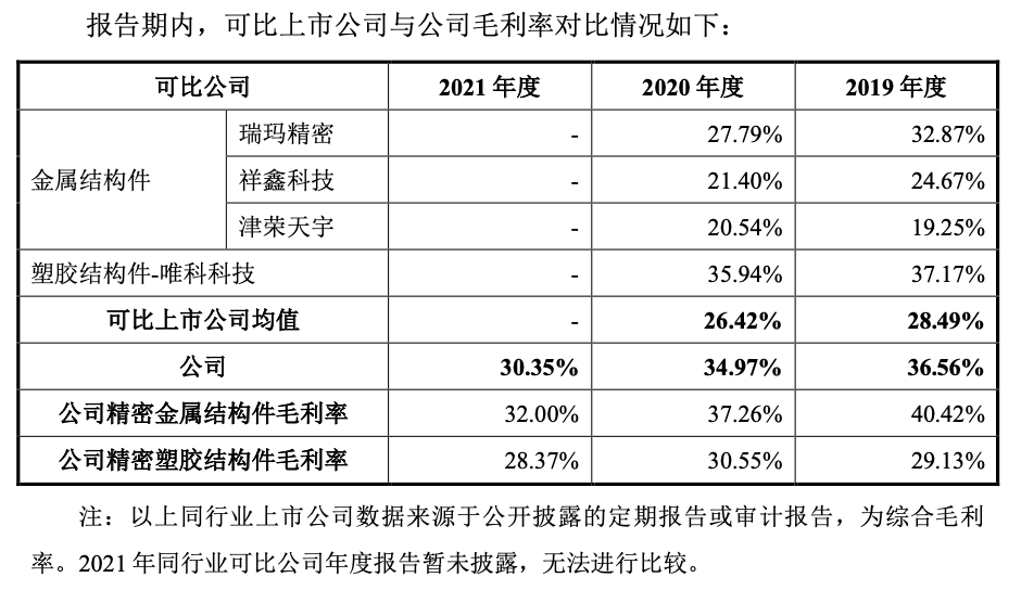 净利润增速放缓直接与毛利率下滑挂钩。报告期内,公司综合毛利率分别为36.56%、34.97%和30.35%,其中精密金属结构件的毛利率分别为40.42%、37.26%、32%。