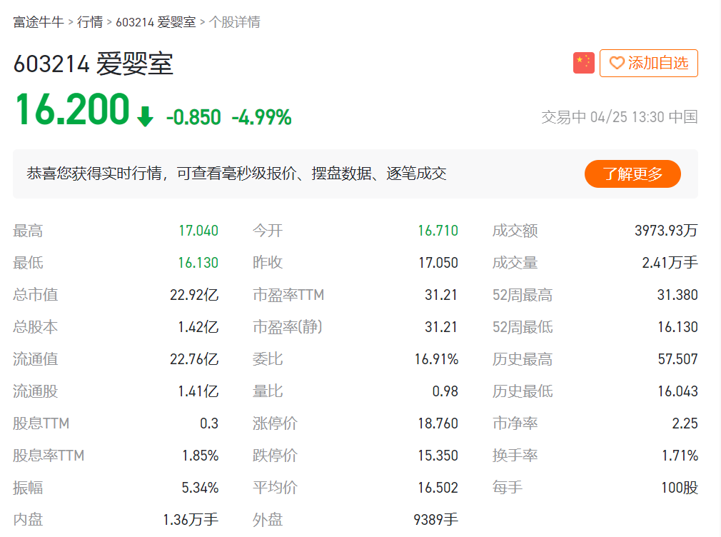 受此消息影响,4月19日开盘,爱婴室的股价大跌7.23%,一度触及跌停。此后两天,爱婴室的股价也保持下跌态势。4月25日,股价一度跌到上市以来的新低16.20元。