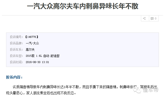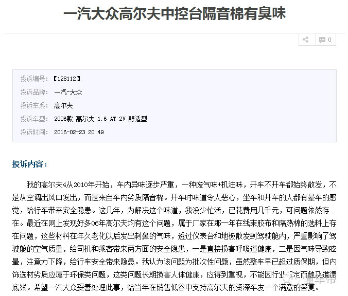 笔者在车质网上,看到高尔夫2016款、2015款和2014年都有关于车内异味的投诉,不过这款10年前的高尔夫居然还有异味。真是活见久!蒙迪欧算是深陷“异味门”的代表,笔者曾经采访过一位蒙迪欧车主,该车主直言自己的车买了将近四年都还有浓厚的异味,简直对长安福特忍无可忍。现在看来,车内异味的持续时间,没有最久只有更久。