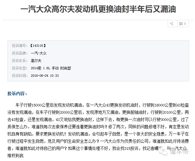车子在行驶15000公里后发现发动机漏油情况,在4S店更换发动机油封后再行驶5000公里,漏油情况再次出现,4S店的处理方案是更换前轴油封,但车主会到汽车投诉网站的原因自然是问题还没解决,发动机漏油问题依然存在。发动机漏油,有可能会引起汽车自燃,是一个很大的安全隐患,为了消费者的人身安全,一汽-大众还是尽快帮助车主彻底解决问题吧。