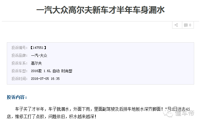 关于高尔夫漏水问题,有的车主投诉天窗漏水,而这位车主则投诉车子买了半年后,就出现了下雨时车身漏水的问题,副驾驶及后排车地板都有很深的积水,送到4S店维修,也只是给打了点胶,但车主表示,问题依旧,而且积水越来越深。