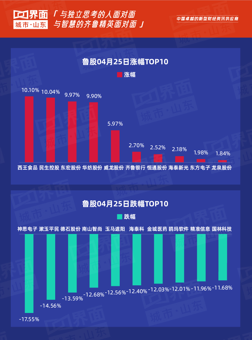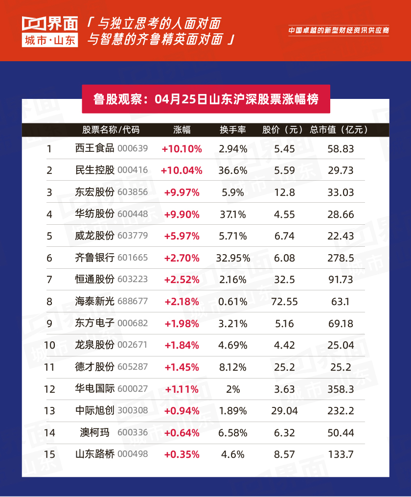 4月25日,山东省内沪深股票有15只个股上涨,250只个股下跌。