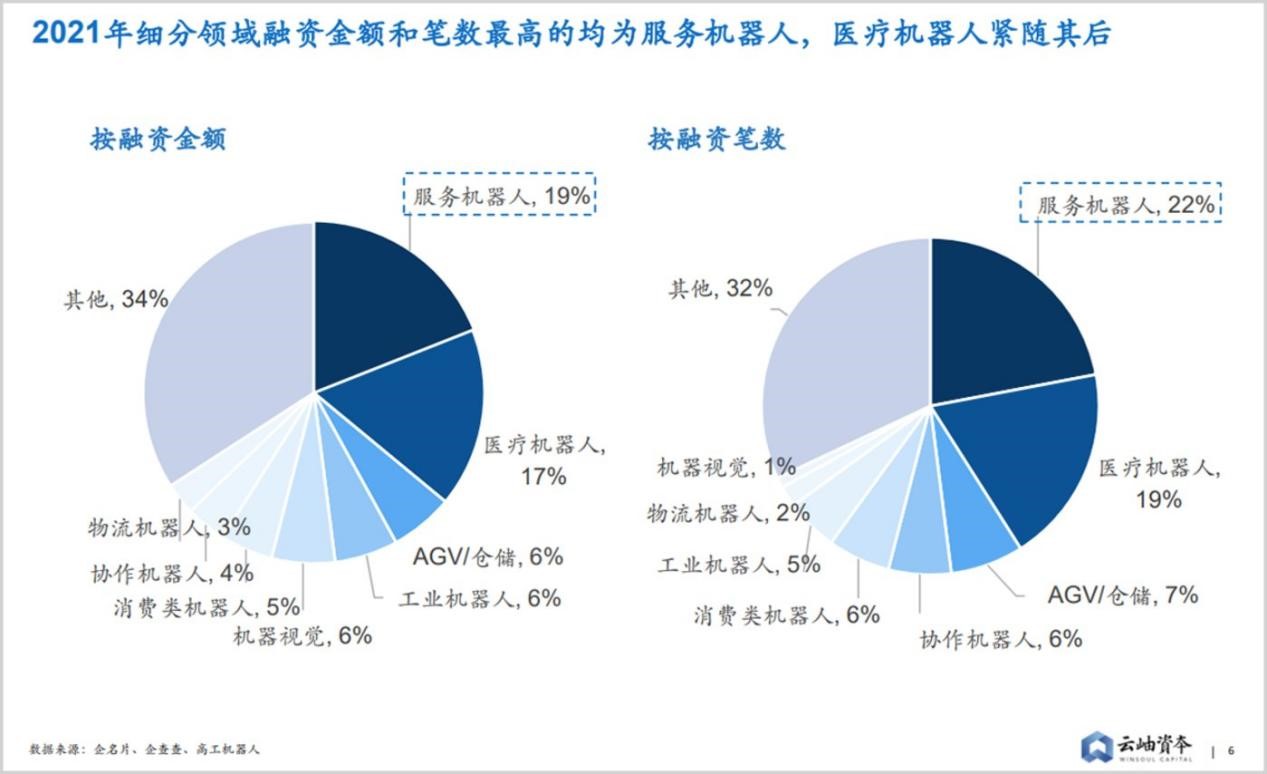 据《洞见▪2021-新兴产业投资机会》报告,在细分领域中,公共服务机器人、医疗机器人领域的投资金额较多,分别占总金额的49.7%与23.7%。仅仅是专业清洁机器人,现实生活里最常见的消杀机器人,全球有50家企业能够提供这种终端设备。