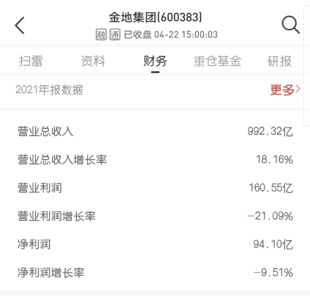 2021年,金地集团实现营业收入992.32亿元,同比上升18.16%;实现归属于上市公司股东的净利润94.1亿元,同比下降9.5%。