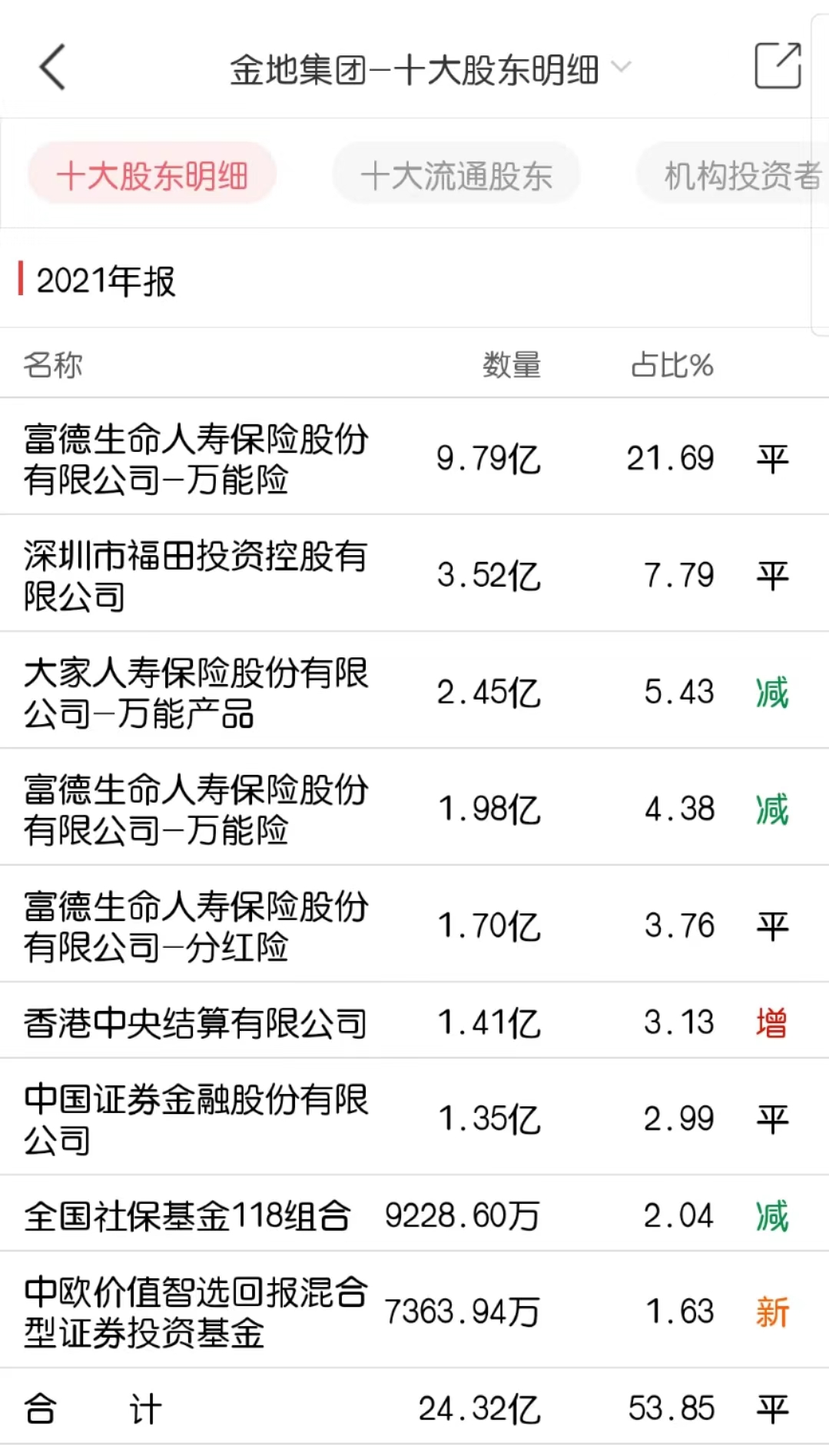 此外,2021年,金地集团受香港中央结算有限公司增持0.47亿股,目前该股东持股占流通股比例3.13%。