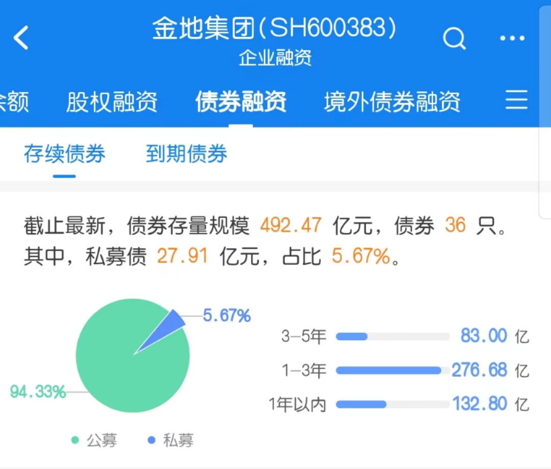 同时,金地集团境内债券存量为36只,共计492.47亿元,其中7只将于一年内到期,金额为132.8亿元,集中兑付压力较大。