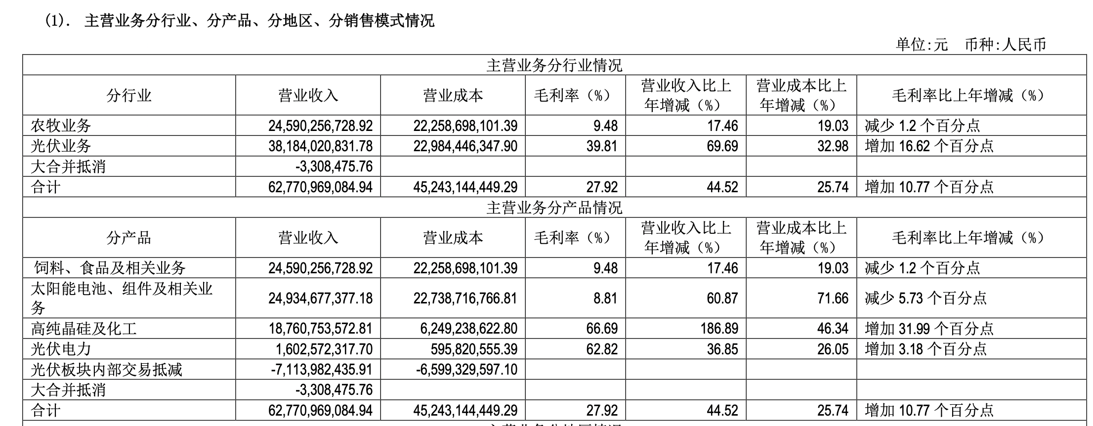 光伏业务中,太阳能电池、组件及相关板块收入最高,同比增长60.87%,达249.3亿元。