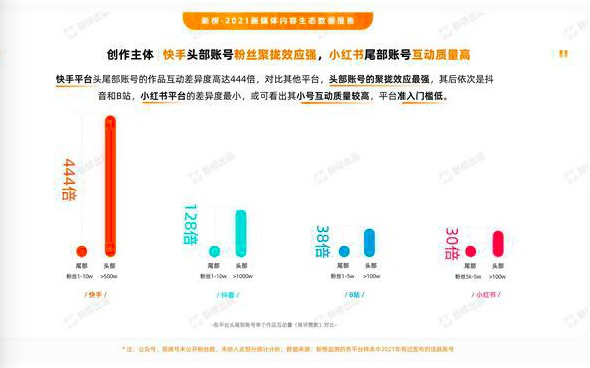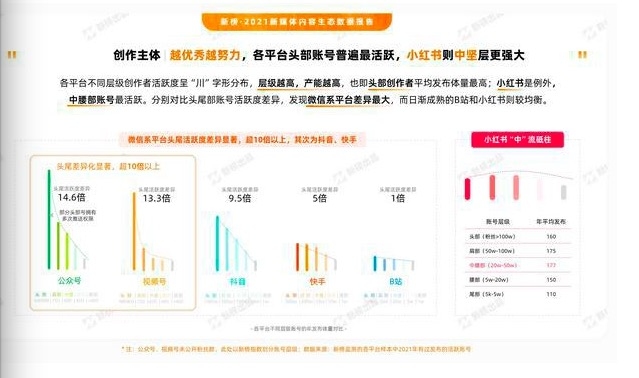 根据《2021年新媒体内容生态数据报告》可以汇总出小红书的部分特色属性,包括:各平台头部账号普遍最活跃,小红书则是20w-50w粉丝的中坚层更活跃;快手、B站的游戏号吸粉力强,抖音、小红书的时尚博主易出圈;短视频带货成常态,抖音、快手的带货视频占比上涨、小红书种草笔记比例走高等等。