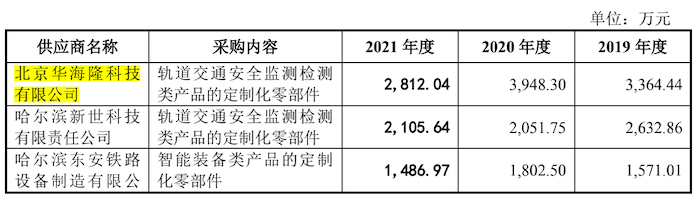 招股书显示,报告期国铁科技第一大供应商仍为北京华海隆科技有限公司,主要采购AEI设备、THDS系统等委外加工件,采购金额占采购总额的比例分别为8.24%、9.00%和5.76%。